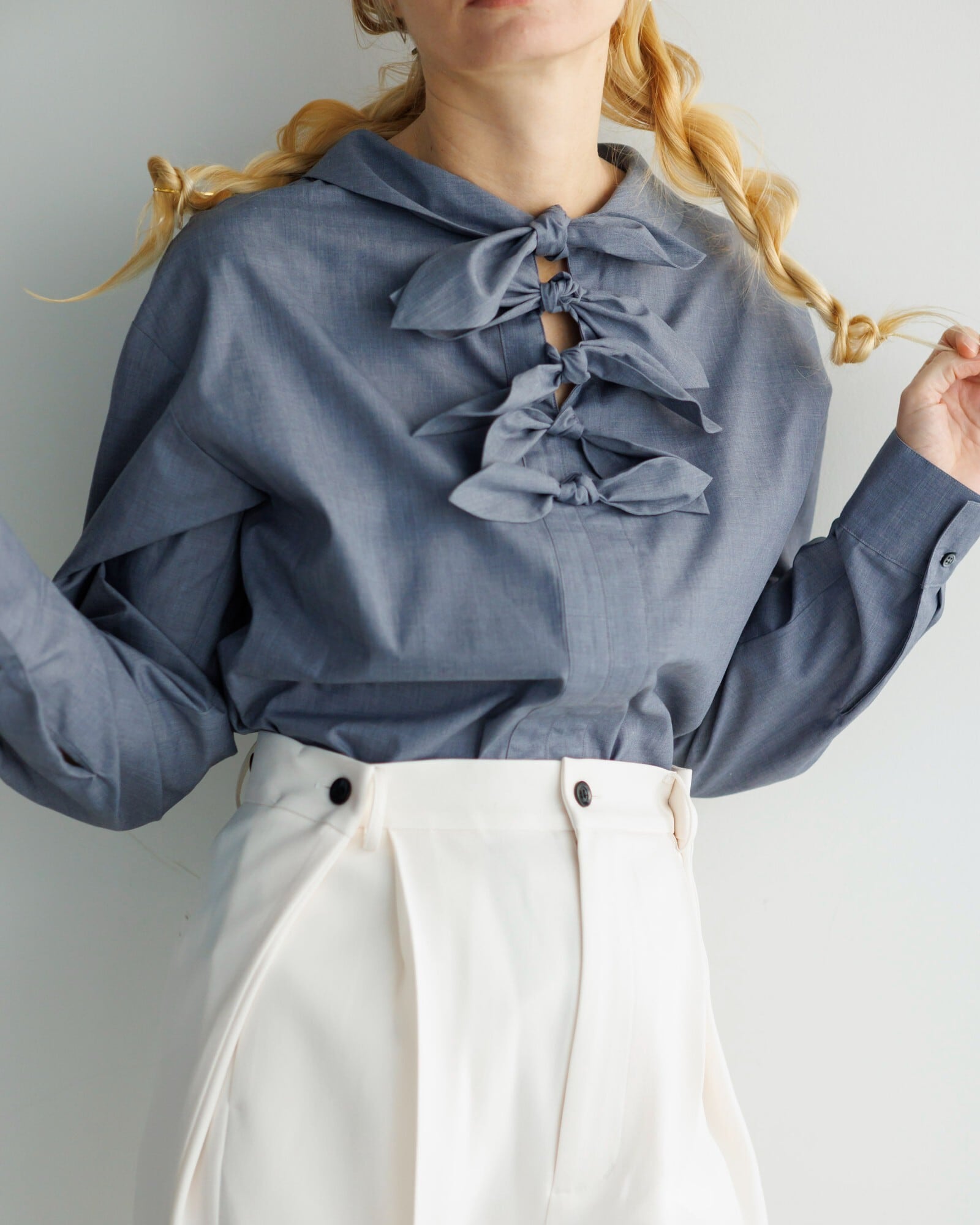 ただ団子結びするだけでリボンの形になるようにしたブラウス